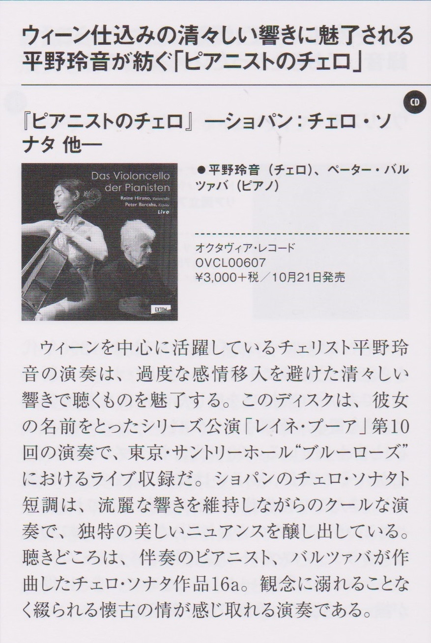 CD「ピアニストのチェロ」が、『Stereo』(ステレオ)2016年12月号の「今月の特選盤」に選ばれました! “ウィーン仕込みの清々しい響きに魅了される 平野玲音が紡ぐ「ピアニストのチェロ」”(貝山知弘) |